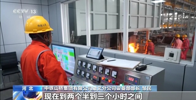 中鐵山橋集團有限公司轍叉分公司設備部部長 鄒民:現在的工作間由以前單一的機械操作平臺,變成現在全自動的。所有的數據采集,包括能源采集、指標各種元素的反饋、安全報警裝置,由以前多人變成現在就由一個操作。以前一爐鋼水得煉四個小時左右,現在到兩個半到三個小時之間。